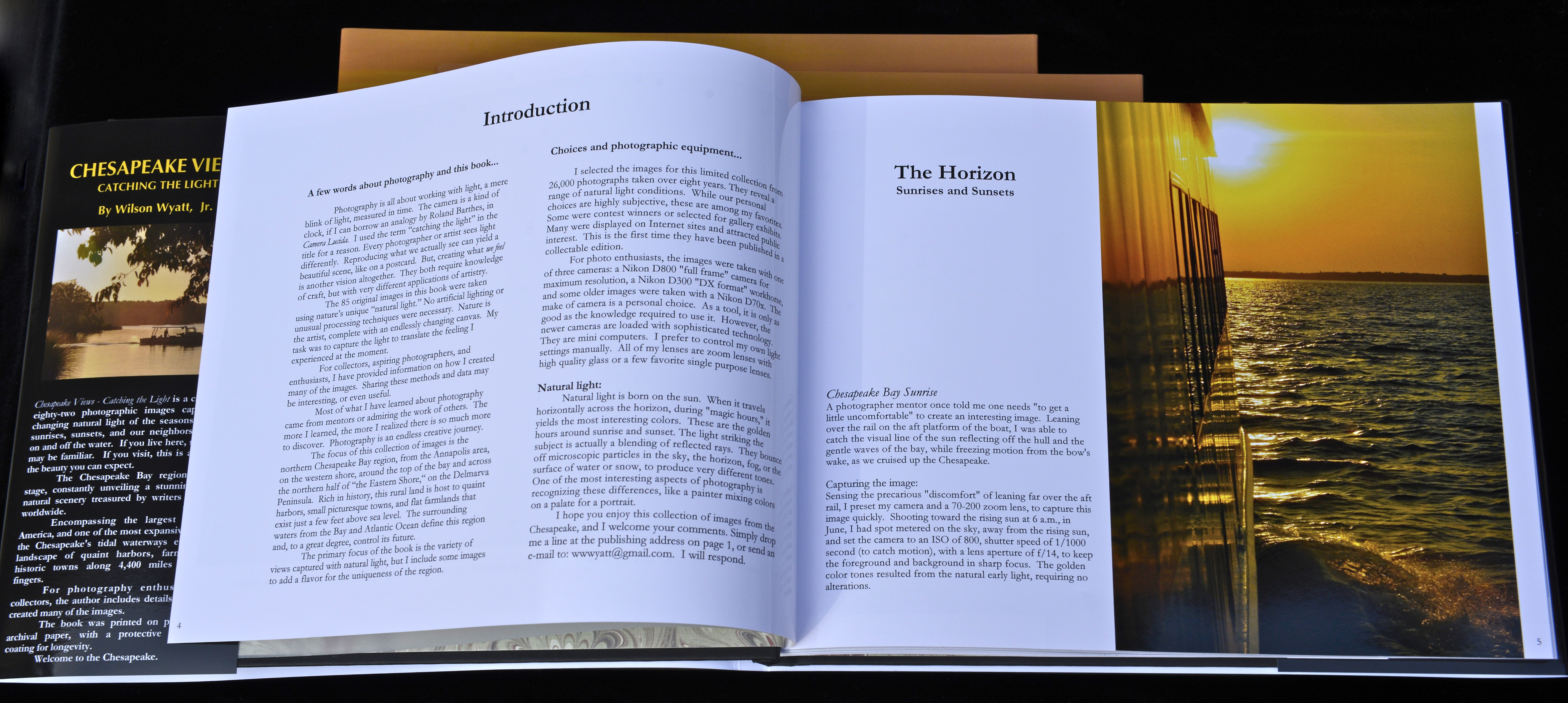 Chesapeake Views–Catching the Light, by photographer and writer Wilson Wyatt, Jr., has been published as a premium quality book of regional color photography. Offered for collectors and photography enthusiasts, the author provides details on how many of the images were taken.